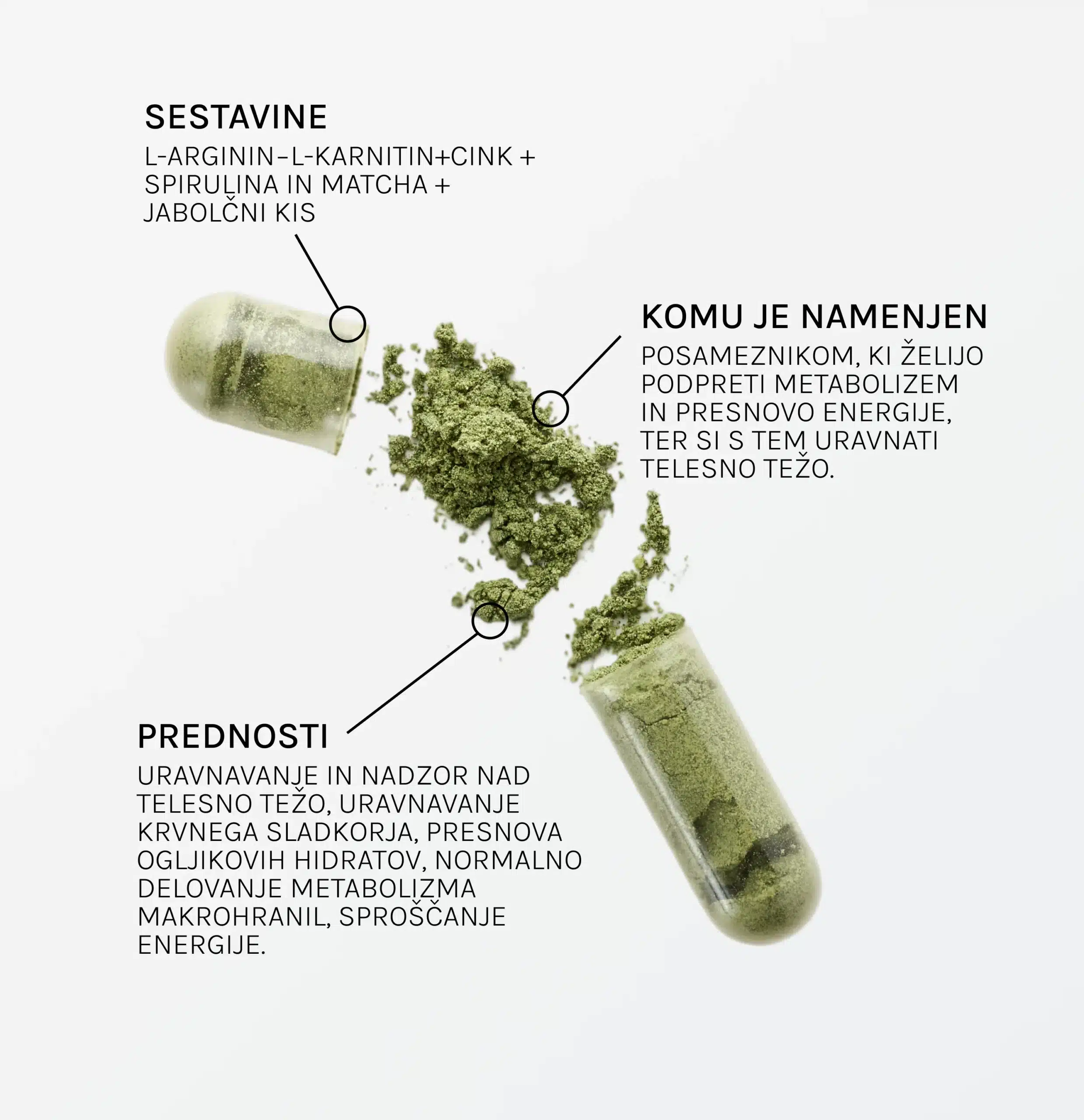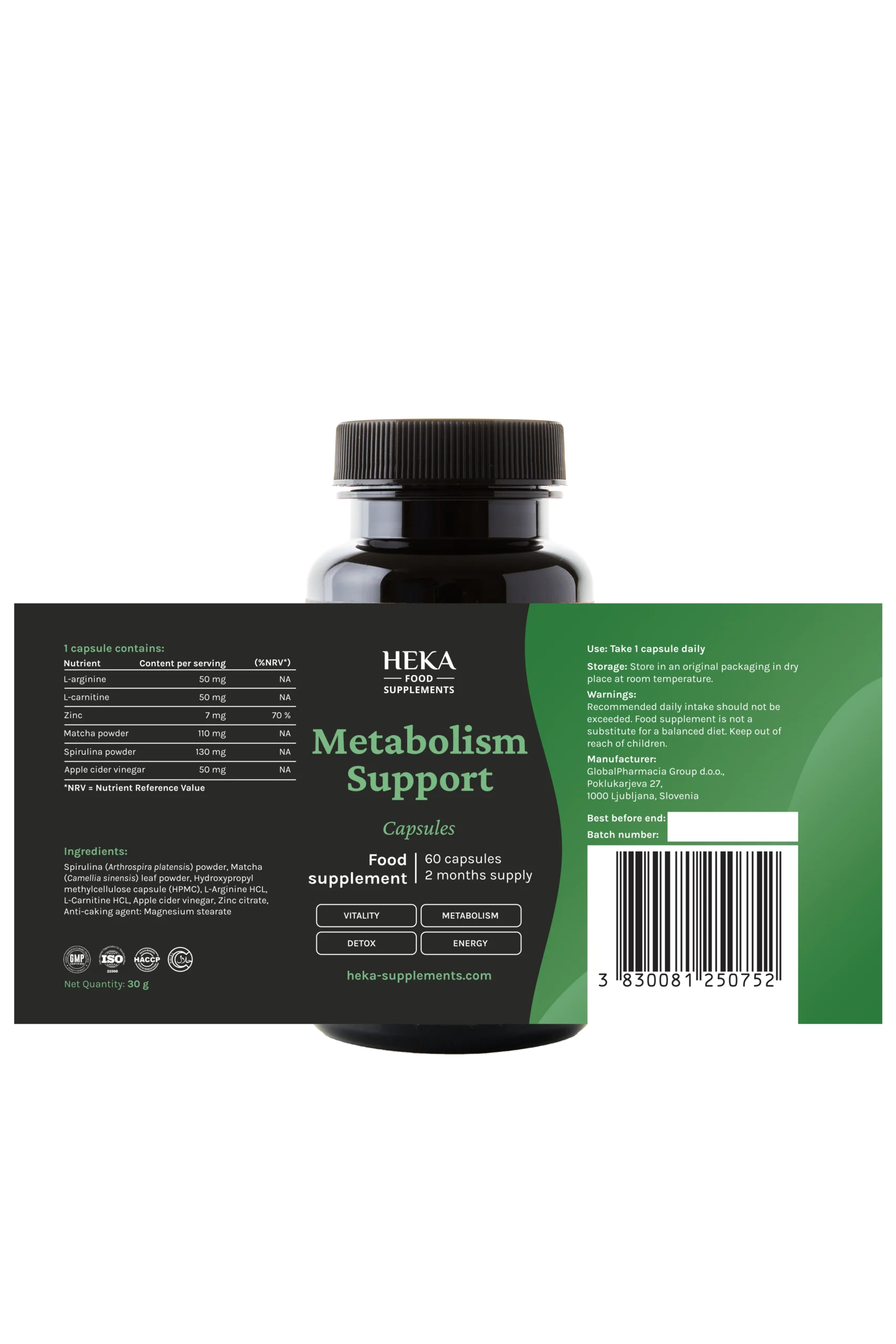 HEKA kapsle pro podporu při regulaci/hubnutí jsou doplněk stravy určený k podpoře metabolismu a energetické rovnováhy. Obsahuje kombinaci spiruliny, matcha prášku, L-argininu, L-karnitinu, jablečného octa a zinku, které společně přispívají k normálnímu metabolismu makroživin, funkci imunitního systému a udržení energie po celý den.