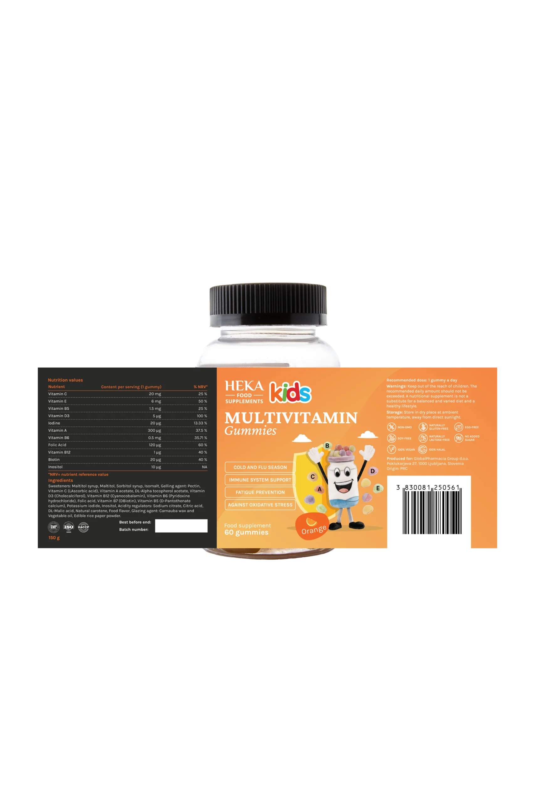 Ukusni gumeni bomboni narančaste boje s okusom naranče koji nude kombinaciju vitamina i minerala — u jednoj dozi (1 gumenom bombonu) sintezu vitamina C, E, B-kompleksa, vitamina D3, vitamina A, folne kiseline, biotina, kao i joda i inozitola. Namijenjeni su kao praktičan dodatak prehrani za podršku imunološkom sustavu, metabolizmu, energiji, koži, kosi, noktima i općem zdravlju djece.