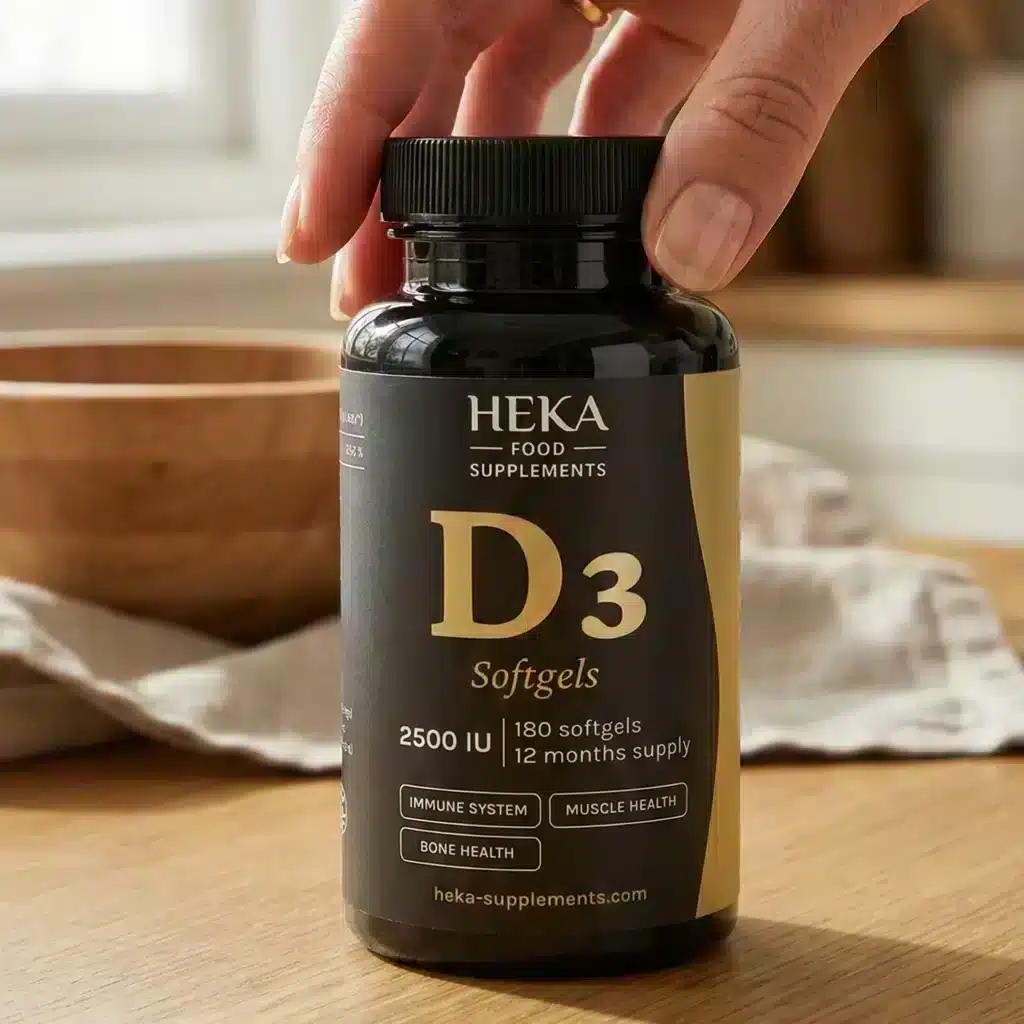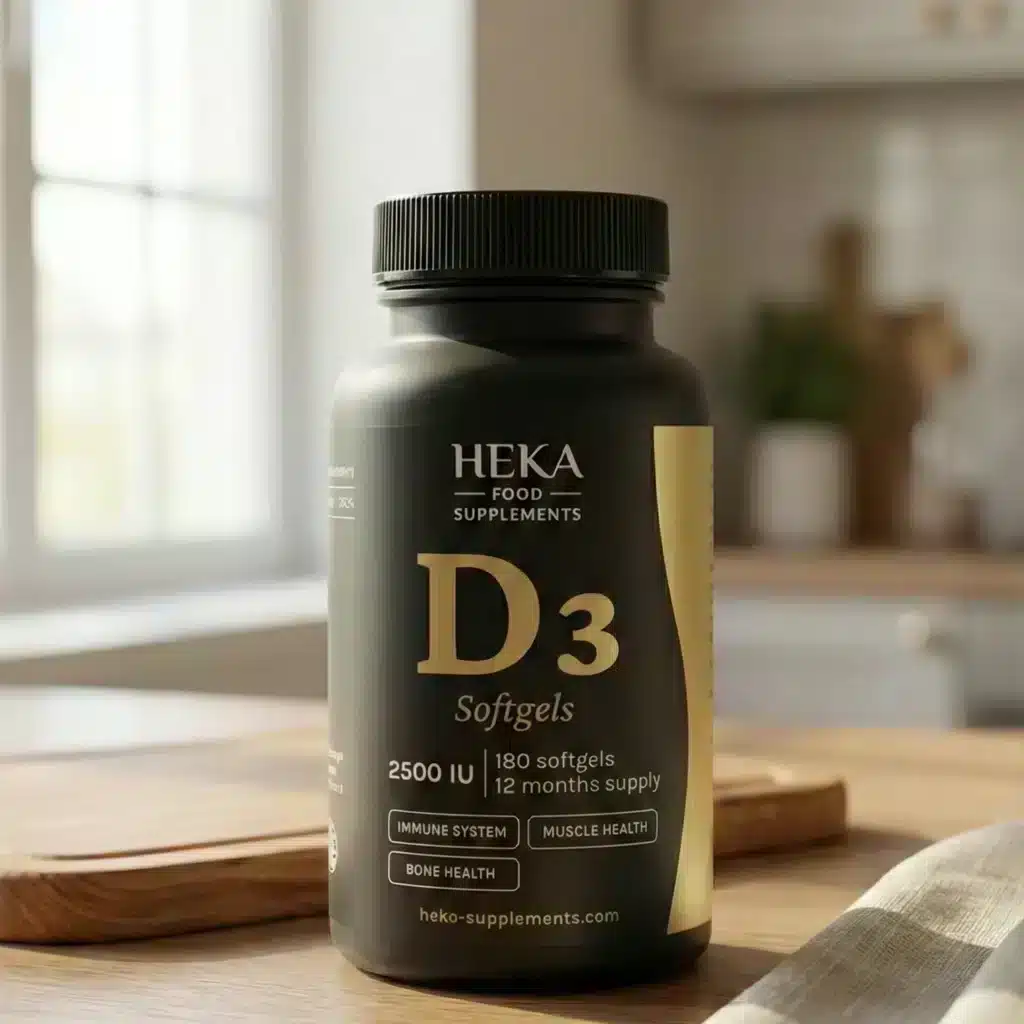 HEKA vitamin D3 meke kapsule su dodatak prehrani u obliku mekih kapsula (softgelova) koji sadrži vitamin D3 (kolekalciferol) u MCT-ulju. Jedna kapsula (2500 IU) osigurava snažnu dozu vitamina D, namijenjenu dopuni prehrambenog unosa i podršci zdravlju – posebno kod nedostatka prirodne sinteze vitamina D zbog nedostatka sunčeve svjetlosti ili nedovoljnog unosa hranom.