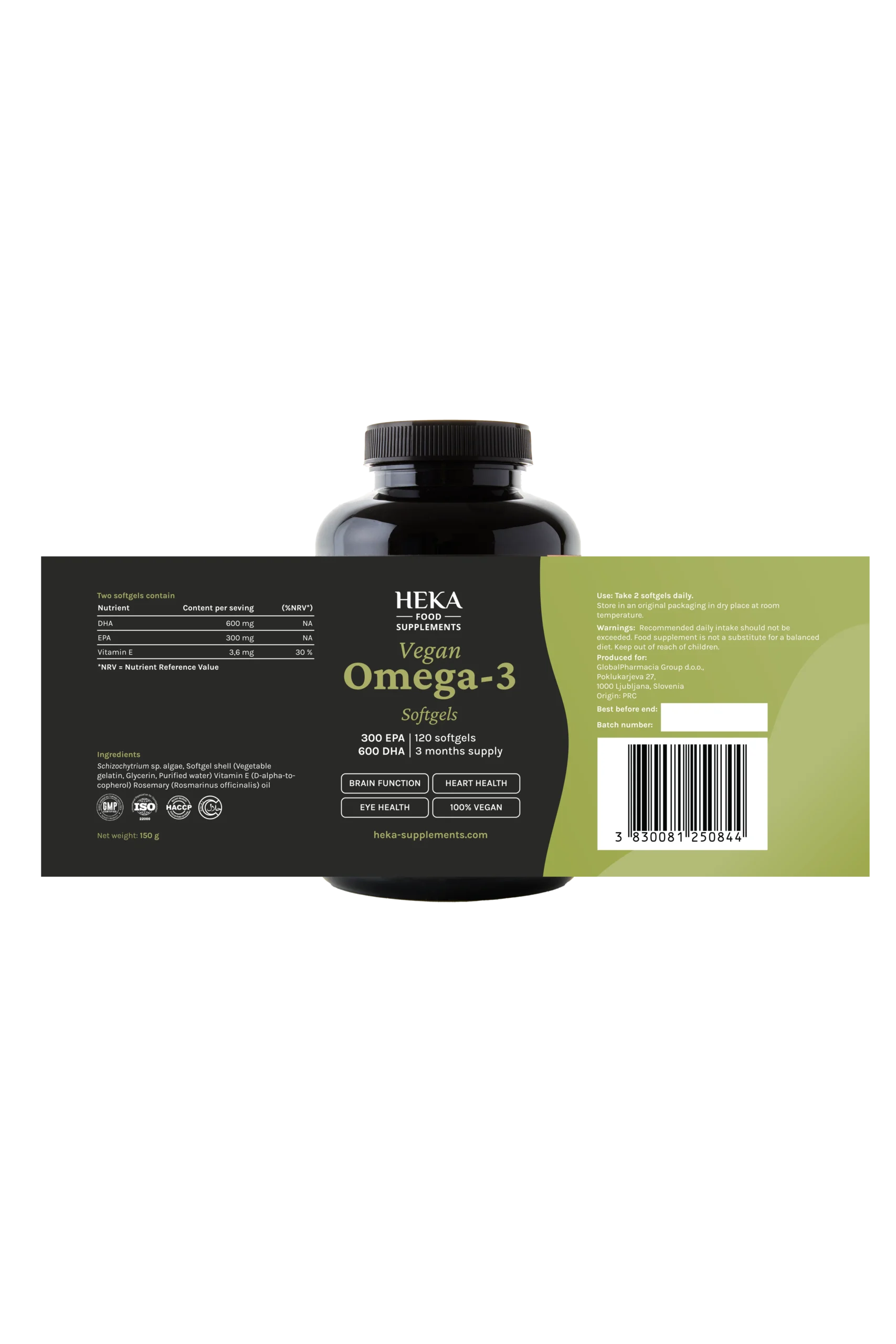 A HEKA vegán Omega-3 lágyzselé kapszula egy növényi eredetű étrend-kiegészítő, algákból (Schizochytrium sp. fajta) nyerik, ami azt jelenti, hogy a termék vegánok és vegetáriánusok számára is alkalmas. Napi két lágyzselé kapszula biztosítja az omega-3 zsírsavakat (beleértve 300 mg DHA-t és 150 mg EPA-t), valamint E-vitamint, mint antioxidánst, a szív, az agy és a látás támogatására.