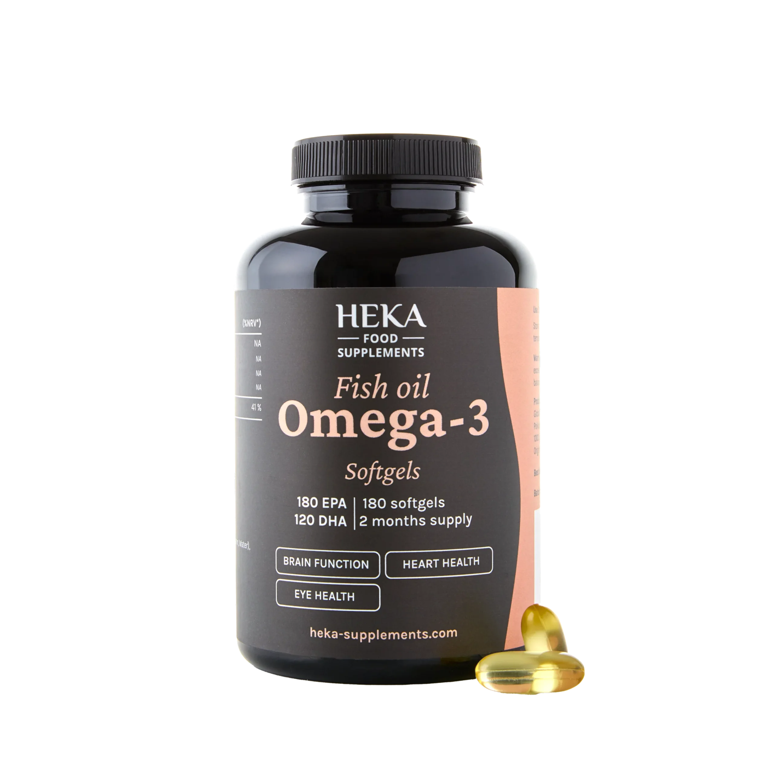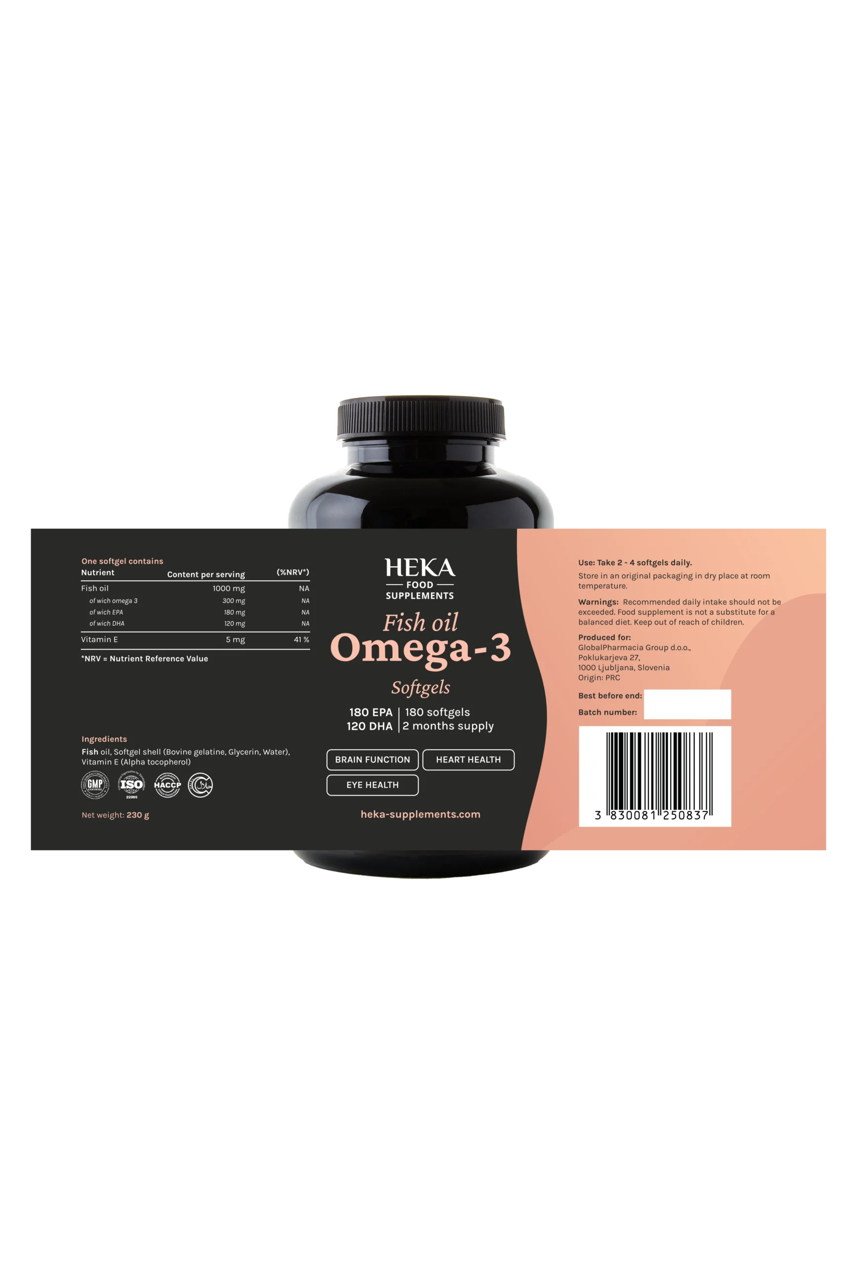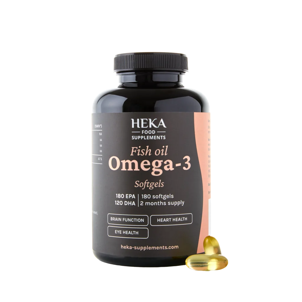 HEKA omega-3 da olio di pesce è un integratore alimentare a base di olio di pesce in capsule molli. Ogni capsula molle contiene olio di pesce, ricco di acidi grassi essenziali omega-3 (EPA e DHA), e vitamina E aggiunta come antiossidante. È destinato all’integrazione regolare di acidi grassi omega-3 per supportare la salute del cuore, del cervello, delle articolazioni, della pelle e il benessere generale.