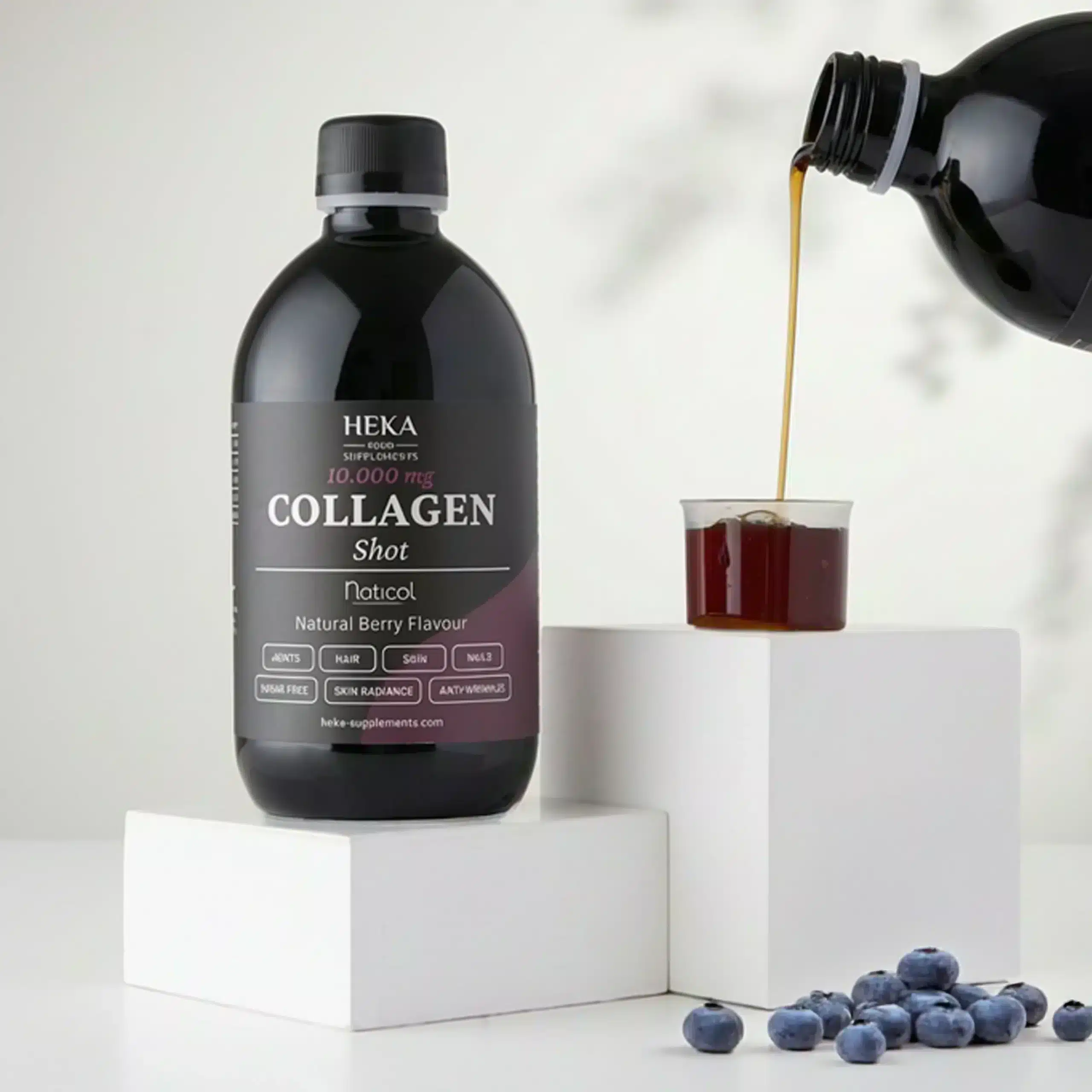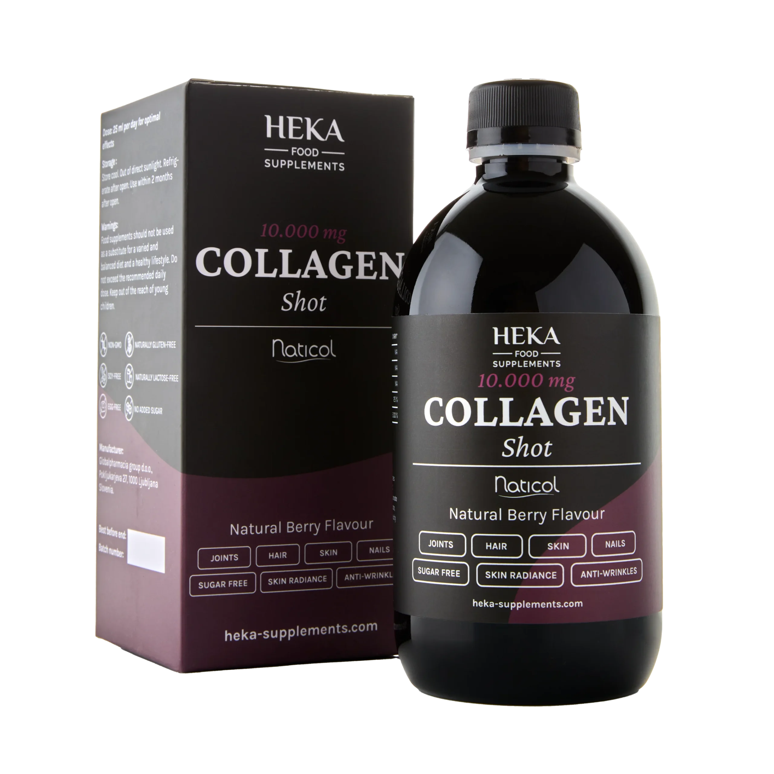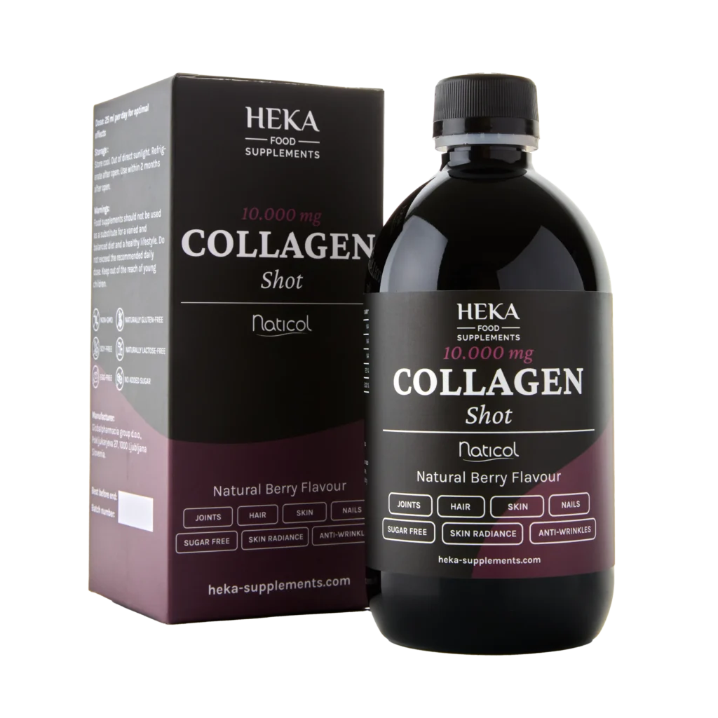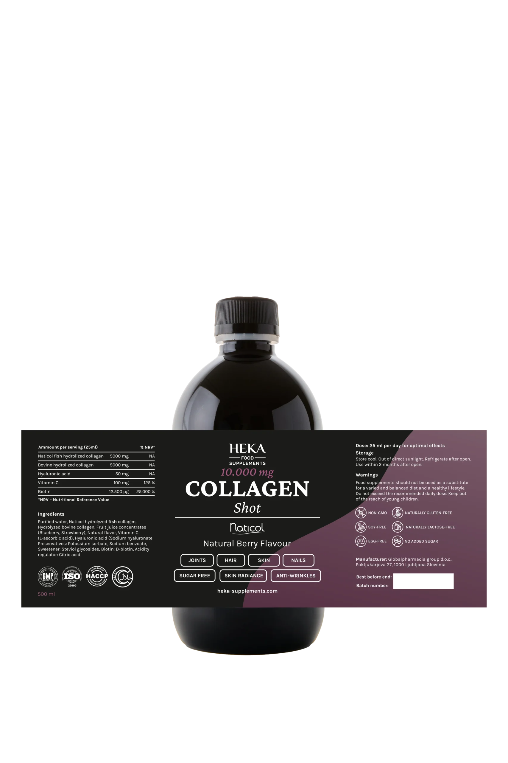 HEKA Collagen Shot 10,000 is a dietary supplement intended for everyone over the age of 20, as collagen production in the body begins to decrease at this age. It is also an ideal choice for those who experience pain during movement, have an overloaded musculoskeletal system, stressed knees from sports or work, as well as for teenagers who have growth problems. HEKA Collagen Shot 10,000 does not contain genetically modified organisms (GMOs), gluten, lactose, soy, and eggs, and is made without sugar.
