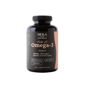 HEKA Omega-3 Fish Oil is a dietary supplement made from fish oil in the form of softgels. Each softgel contains fish oil rich in essential omega-3 fatty acids (EPA and DHA), and added vitamin E as an antioxidant. It is intended for regular supplementation of omega-3 fatty acids to support heart, brain, joint, and skin health, and overall well-being.