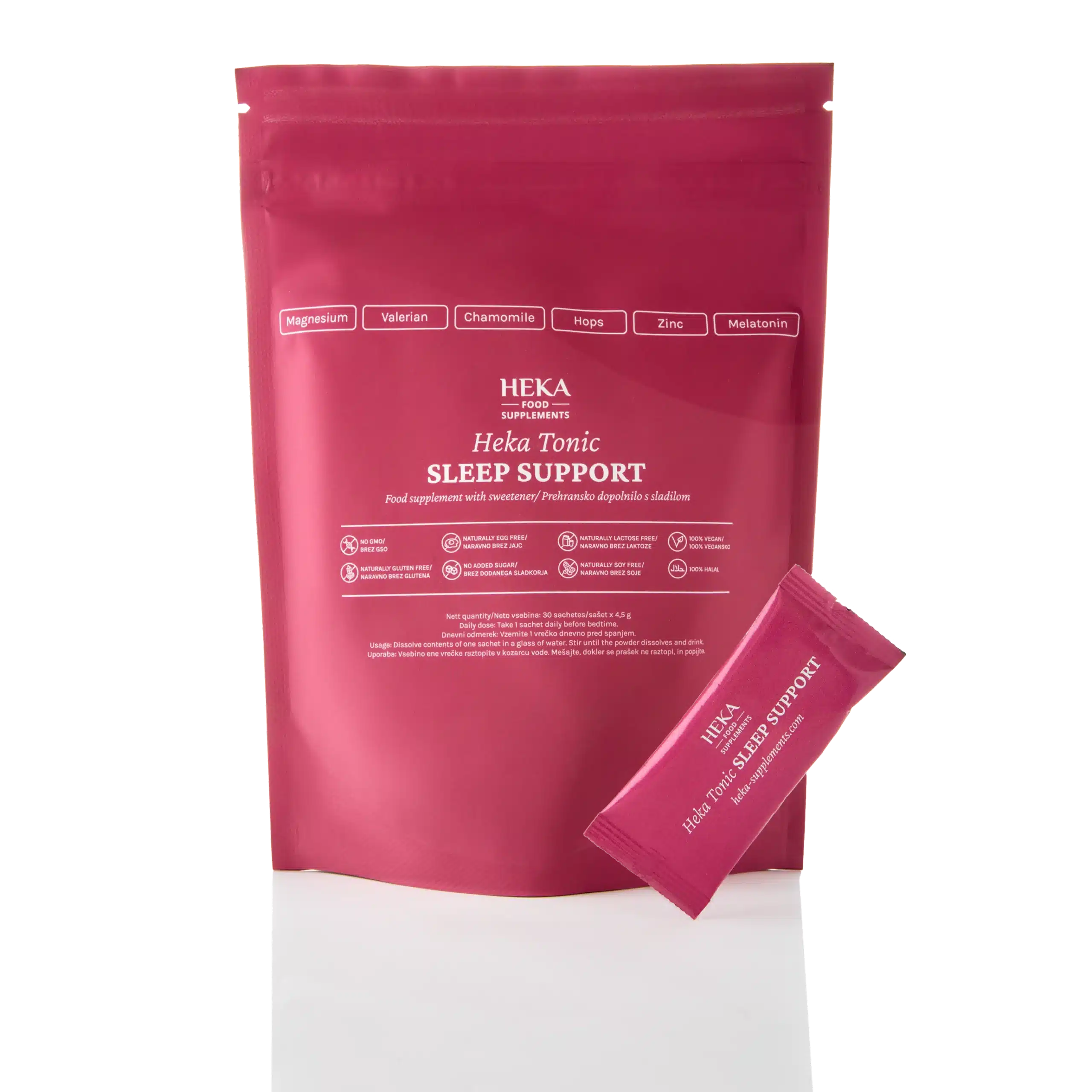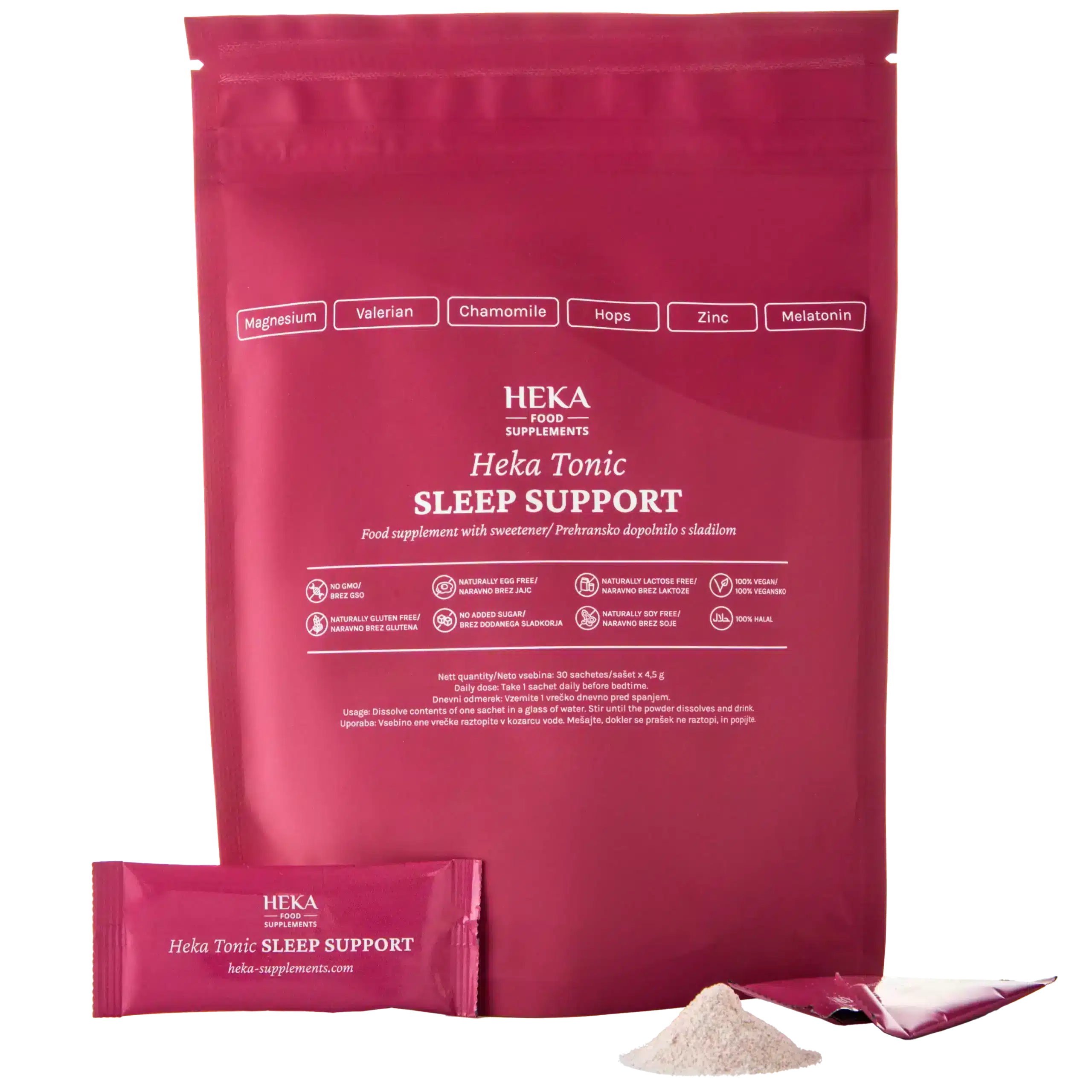 BĂUTURA HEKA pentru susținerea somnului este un supliment alimentar sub formă de pudră – o combinație de magneziu, zinc, melatonină și extracte naturale (valeriană, mușețel, hamei). Conținutul unui plic dizolvat în apă înainte de culcare ajută organismul să se relaxeze, să adoarmă mai repede și susține un somn odihnitor pe timpul nopții.