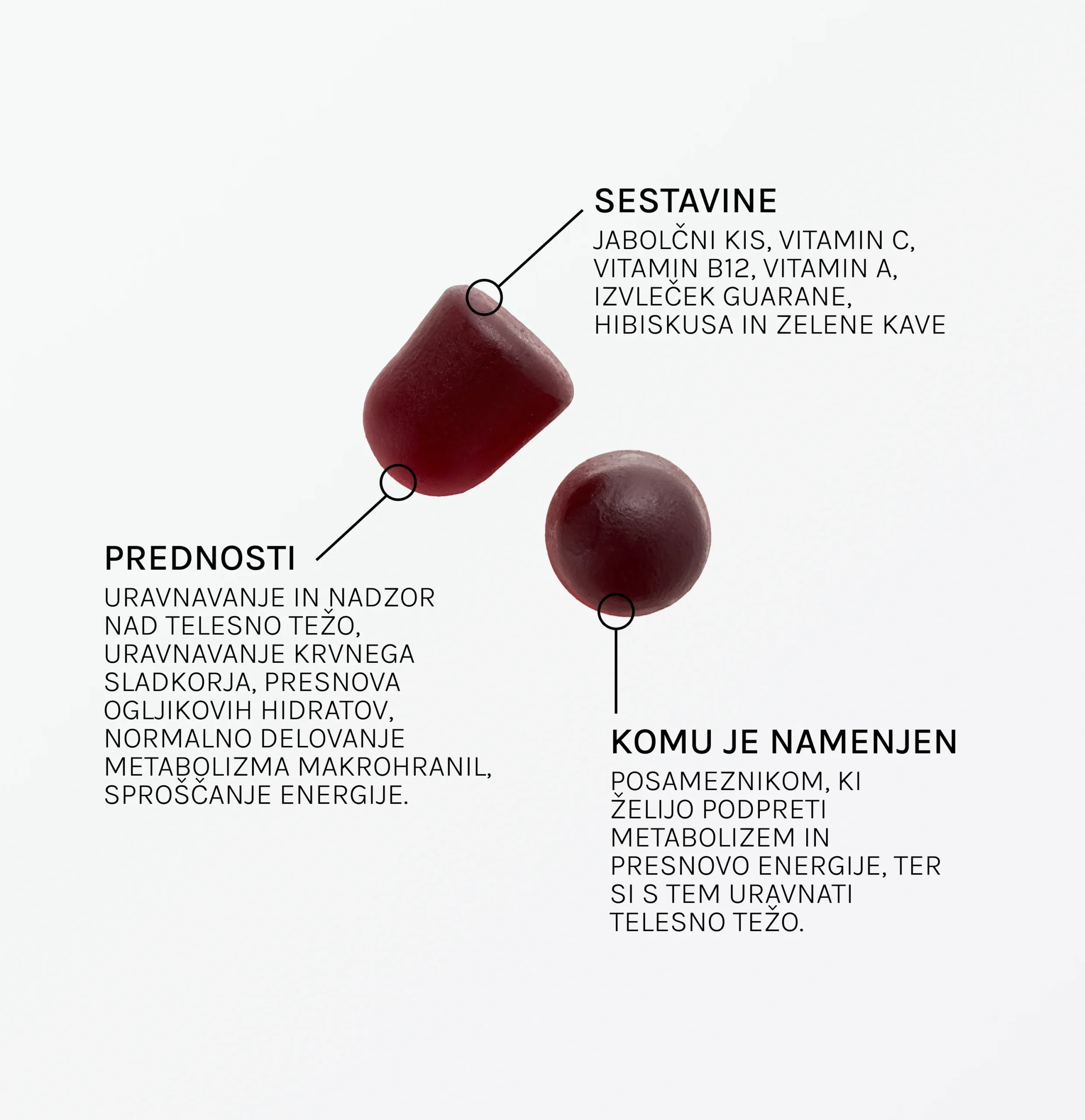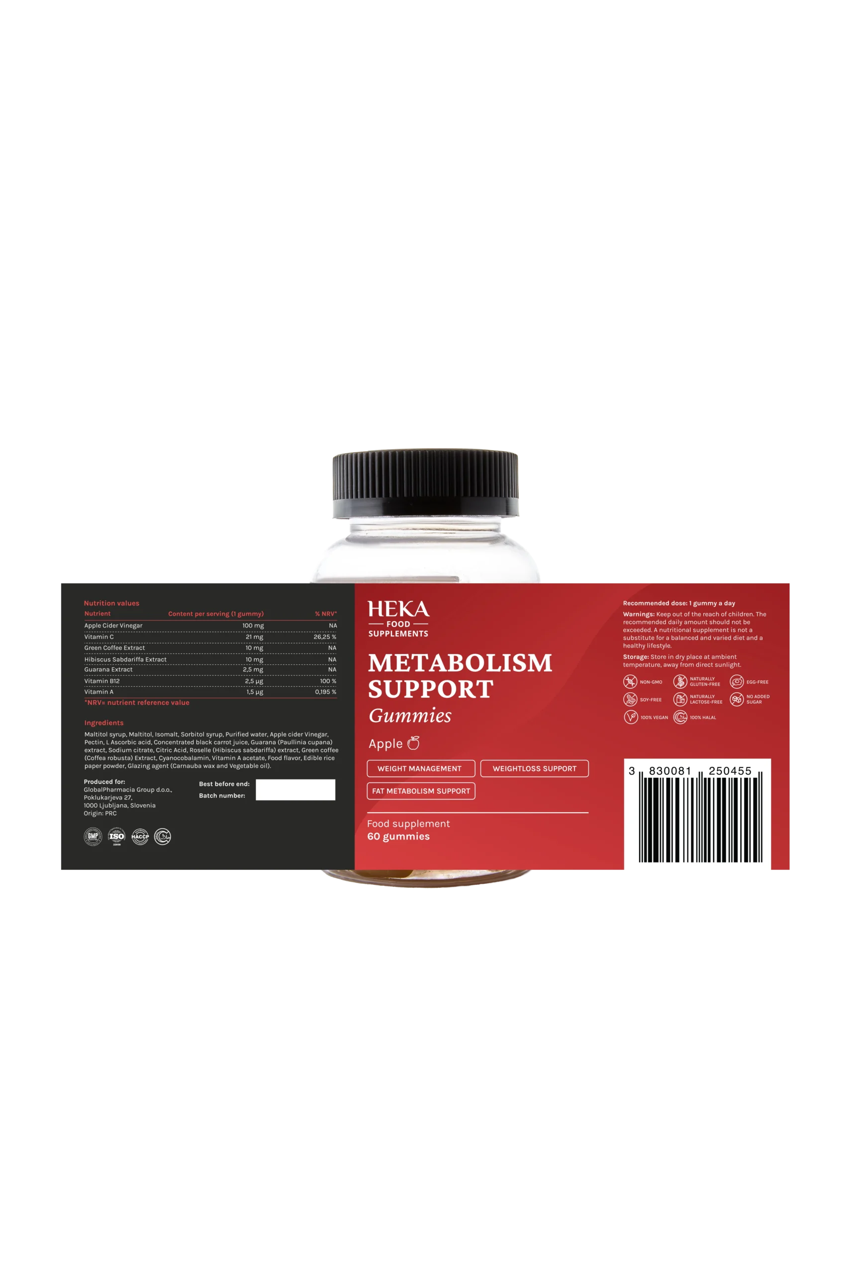 Gumele HEKA pentru susținerea reglării/pierderii în greutate sunt un supliment alimentar sub formă de gume delicioase, roșu închis, cu aromă de mere. Fiecare gumă conține un amestec de nutrienți și extracte de plante — inclusiv vitamina C, extract de cafea verde, hibiscus, extract de guarana și vitamina B12 — concepute pentru a susține metabolismul, sistemul imunitar și energia.