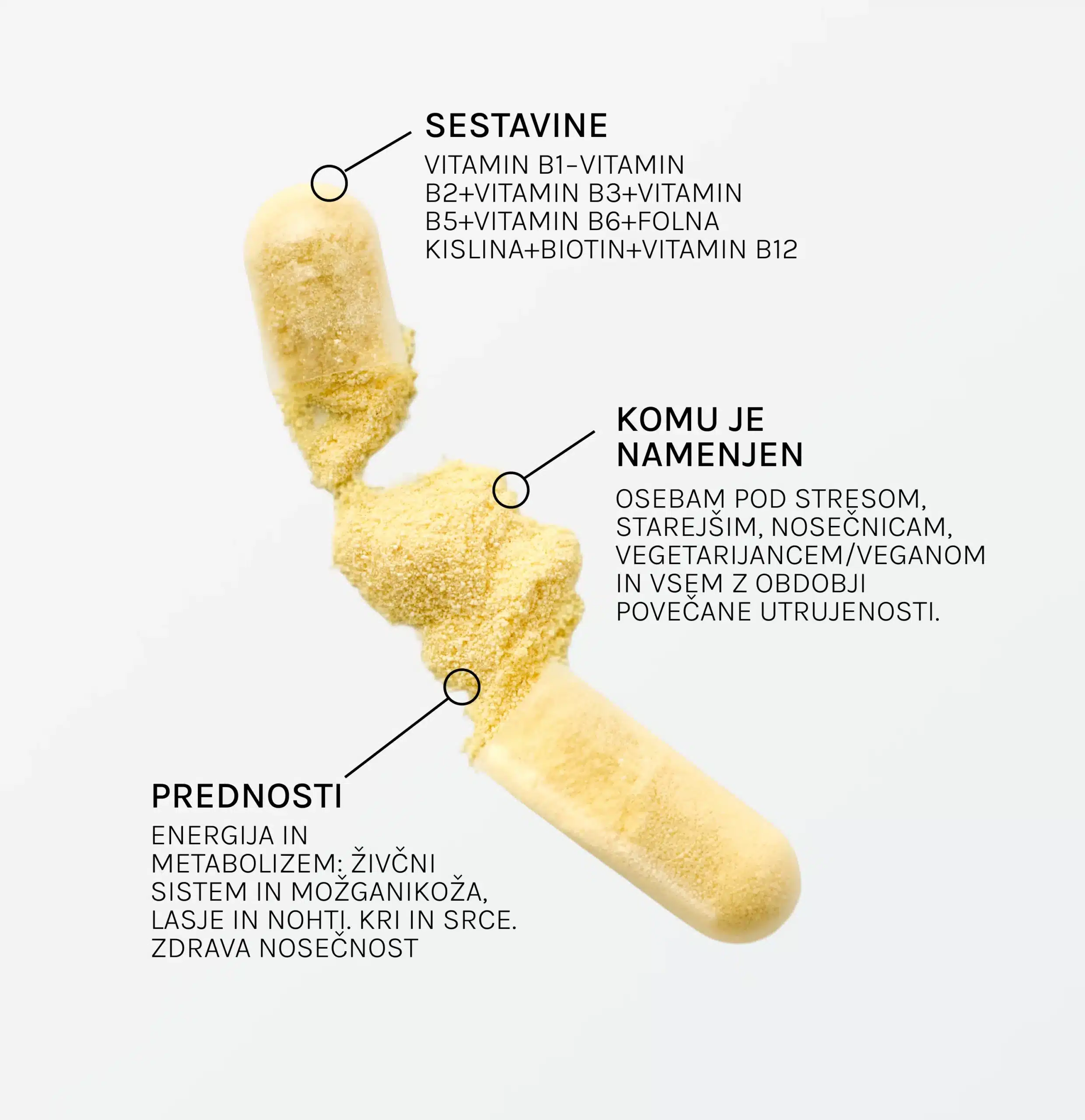 Suplimentul alimentar conține o combinație de vitamine din complexul B (B1, B2, B3, B5, B6, B9/acid folic, B7/biotină, B12) într-o capsulă convenabilă pentru a susține metabolismul normal al carbohidraților, energia și sistemul nervos. O capsulă pe zi oferă un spectru larg de vitamine B în doze care acoperă sau depășesc dozele zilnice recomandate.