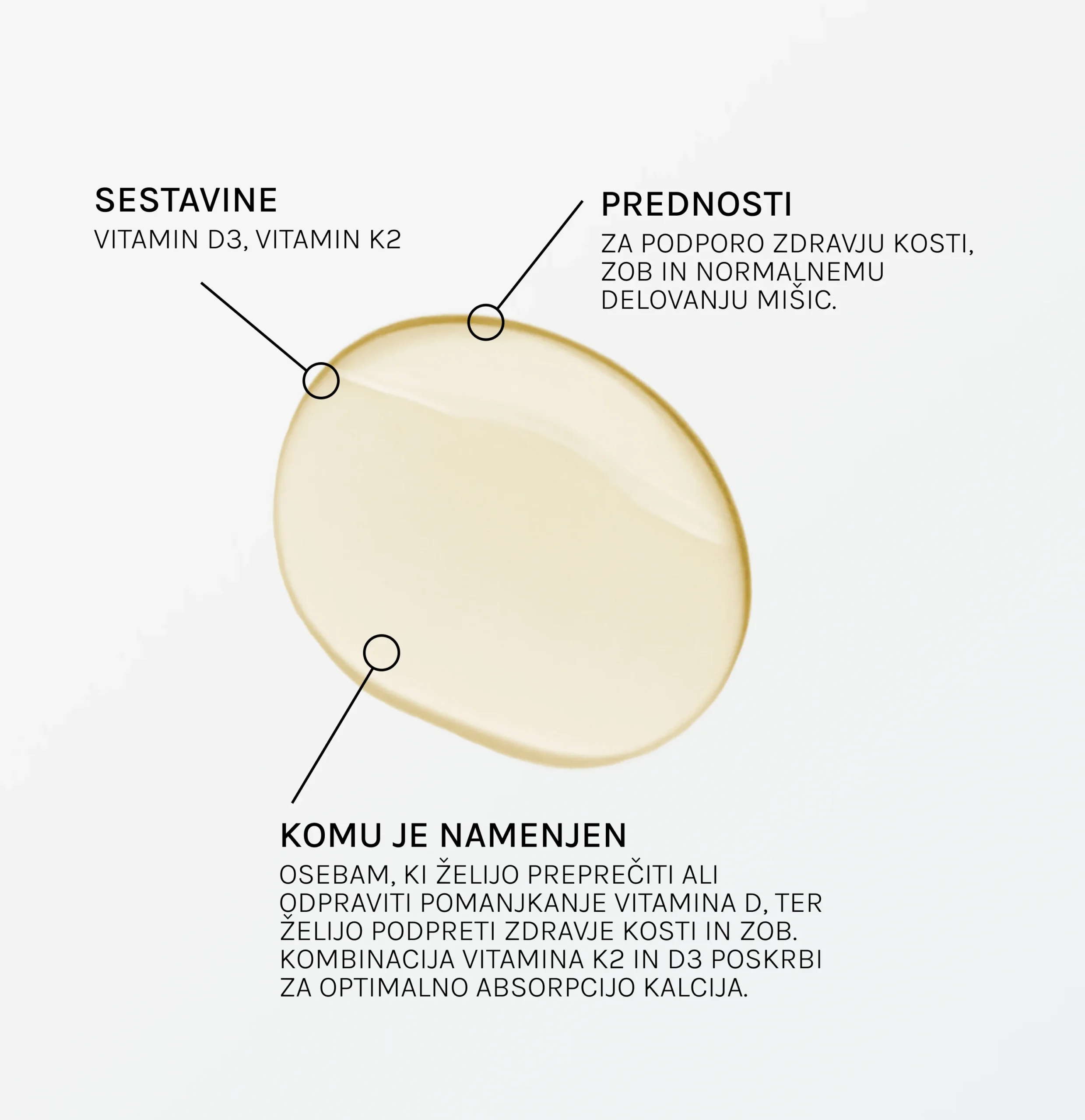 Kvapky aplikujete priamo do úst alebo ich pridáte do nápoja či jedla. Kombinácia D3 a vitamínu K podporuje normálne fungovanie imunitného systému, svalovú funkciu a pevnosť kostí a zdravie zubov vo všetkých ročných obdobiach.