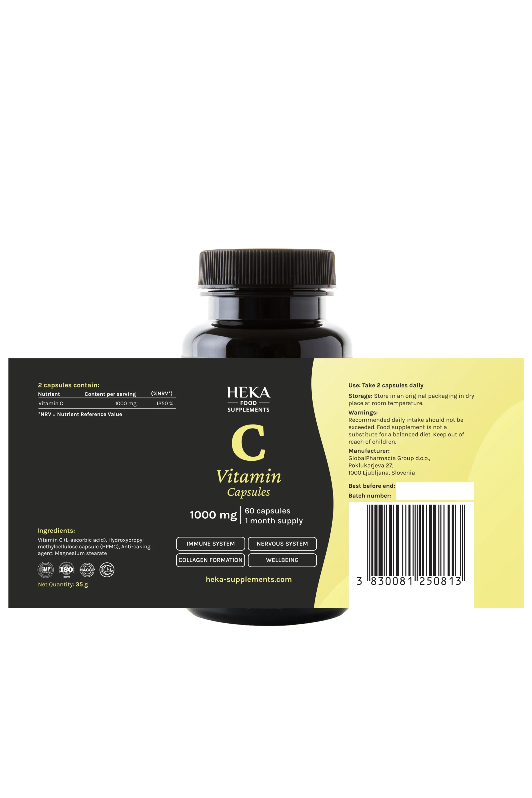 HEKA vitamín C kapsuly sú výživový doplnok s vysokým obsahom vitamínu C (kyselina L-askorbová), vo vegánskych HPMC kapsulách. S dvoma kapsulami denne vnesiete do tela silnú dávku vitamínu C, určenú na podporu imunitného systému, antioxidačnú ochranu a zdravie pokožky, tkanív a metabolických procesov.