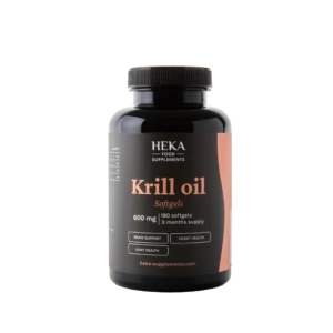 HEKA krilovo olje mehke kapsule so prehransko dopolnilo na osnovi krilovega olja, ki zagotavlja esencialne omega-3 maščobne kisline (EPA in DHA) ter naravne fosfolipide za boljšo absorpcijo. Ena mehka kapsula prispeva k podpori srca, možganov in splošnega dobrega počutja, obenem z dodano vrednostjo kakovostnih maščob, ki jih telo nujno potrebuje in jih pogosto primanjkuje v sodobni prehrani.
